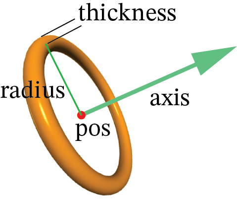The pos of a ring is at its center. The axis of a ring determines only the orientation of the ring; the magnitude of axis is ignored. The default size of a ring is unusual: <0.2, 2, 2>. The outer radius is radius+thickness, and the inner radius is radius-thickness.